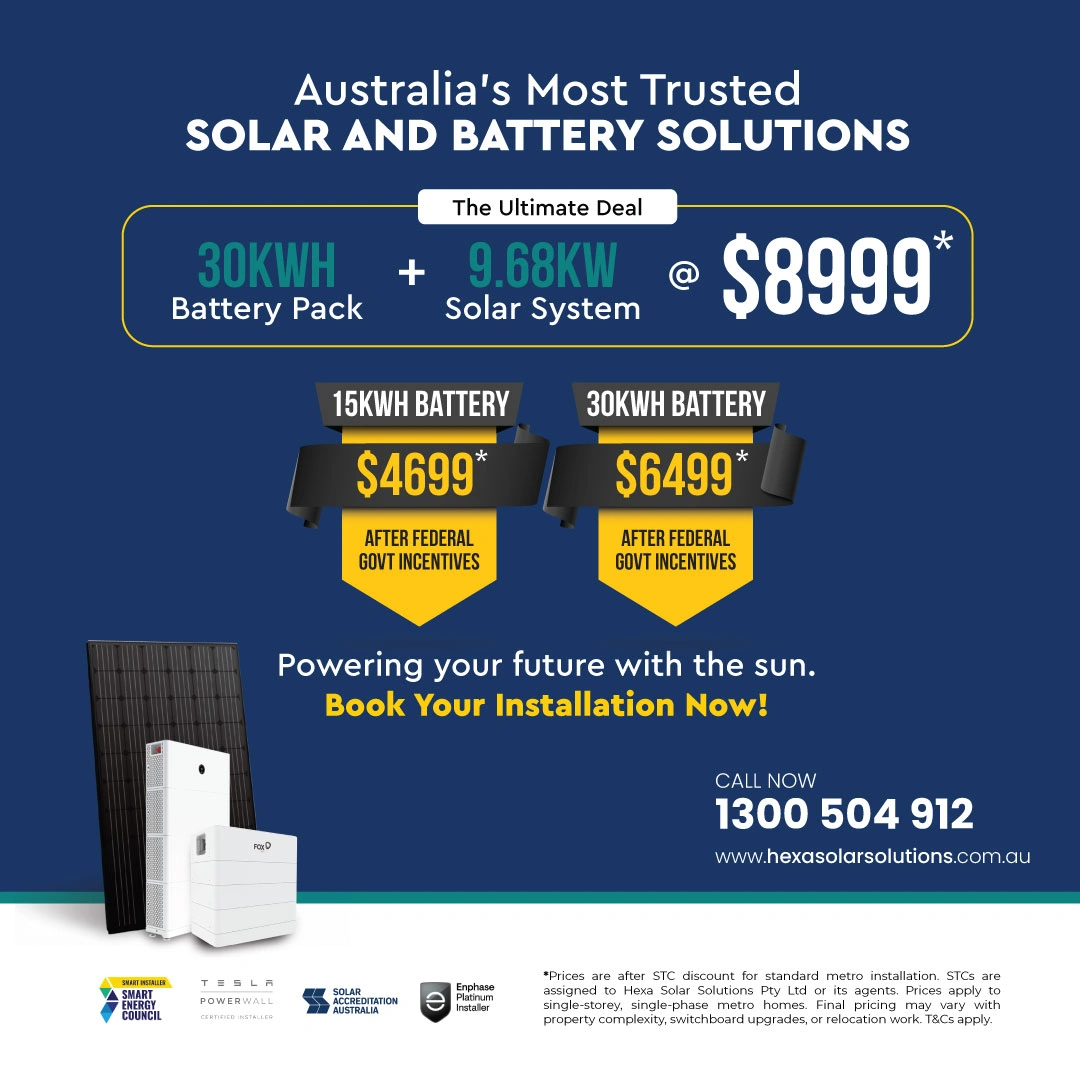 * Prices are after STC discount for standard metro installation. STCs are assigned to Hexa Solar Solutions Pty Ltd or its agents. Prices apply to single-storey, single-phase metro homes. Final pricing may vary with property complexity, switchboard upgrades, or relocation work. T&Cs apply.
